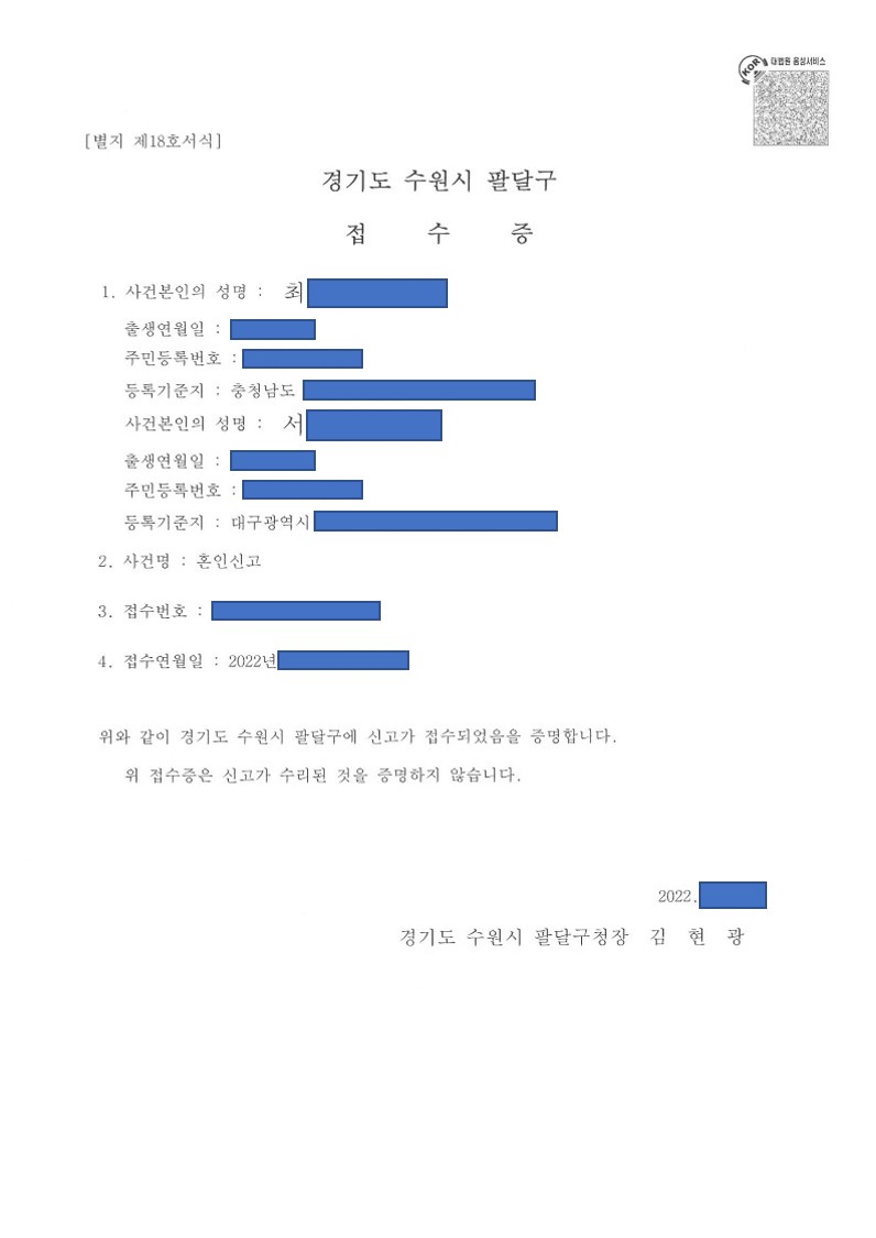 ±×¸®°í Á¢¼ö ÈÄ ¾à ÀÏÁÖÀϸ¸¿¡ Á¤»óÀûÀ¸·Î È¥ÀÎ½Å°í°¡ ¿Ï·áµÇ¾î È¥Àΰü°èÁõ¸í¼¸¦ ¹ß±Þ¹Þ¾Æ º¸³»µå·È½À´Ï´Ù.